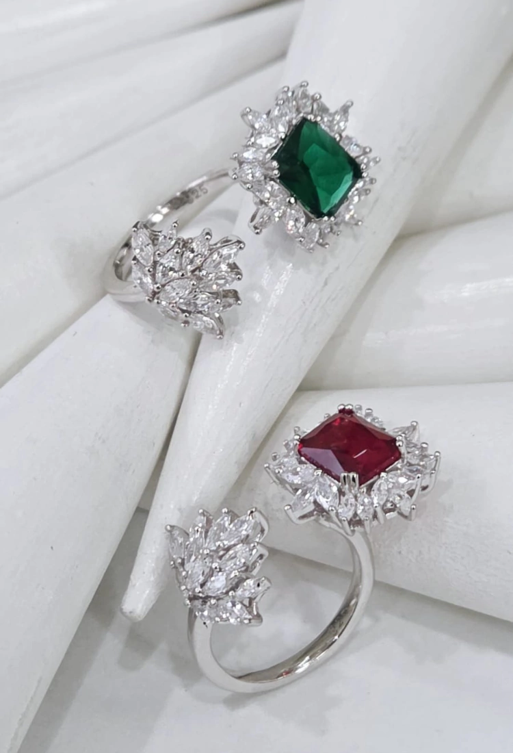 Impactantes y sofisticados, estos anillos abiertos están realizados en plata 925, rodinados en oro blanco y protagonizados por cristales centrales color esmeralda o rubí, enmarcados por un halo de brillantes baguette.
