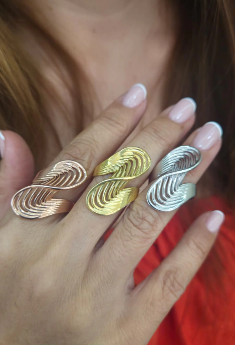 Sus líneas onduladas generan un efecto visual dinámico, casi escultórico, que envuelve el dedo con elegancia y modernidad. Una joya que destaca por su presencia, su diseño fluido y su estilo único, ideal para mujeres que aman las piezas con carácter y sensibilidad artística.